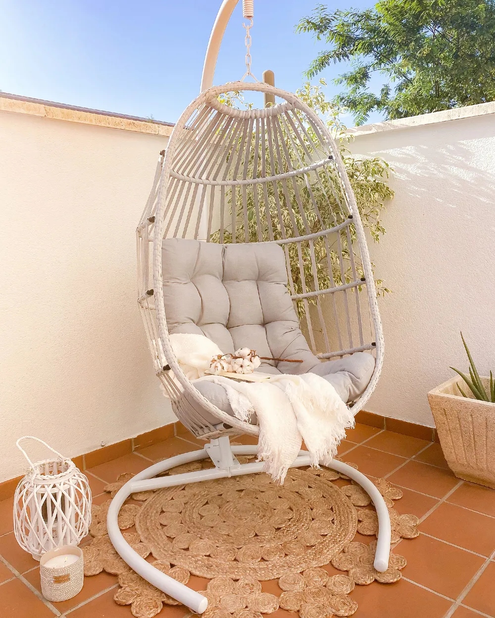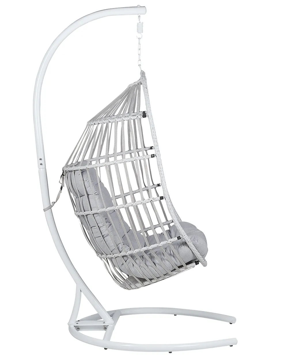 Dotata di una struttura leggermente curva, questa squisita poltrona sospesa ti offrirà un comfort assoluto e la robusta base in metallo garantisce la massima stabilità. Il cesto in rattan sintetico e la sua morbida imbottitura rendono questo mobile un luogo confortevole dove rilassarsi. Il cuscino del sedile è inoltre protetto dai raggi UV, quindi puoi goderti questa sedia all'esterno e all'interno, starà particolarmente bene in Boho e negli interni arredati in stile moderno.