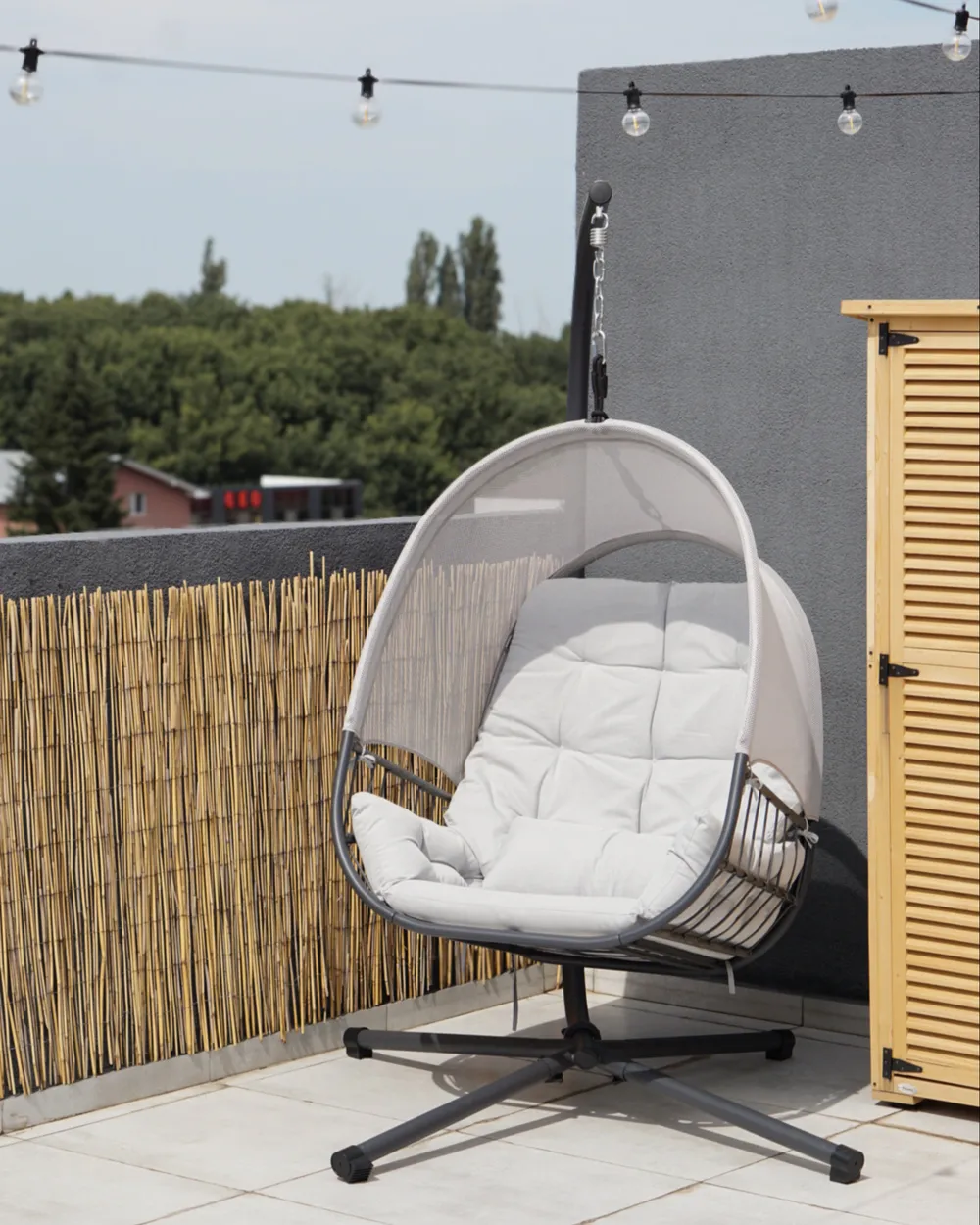 Crea uno spazio accogliente in giardino con questa elegante poltrona sospesa, pensata per un relax totale. La • Robusta struttura in acciaio garantisce stabilità, mentre gli elementi in rattan e la cappottina in rete aggiungono un tocco di stile senza tempo. Un cuscino morbido assicura un comfort eccezionale, e il dolce dondolio dalla sospensione a catena arricchisce l’esperienza rilassante. Realizzata con materiali resistenti all’acqua e ai raggi UV, è un angolo durevole e invitante per rilassarsi all’aperto.